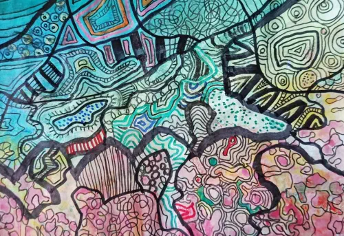 This painting is a lively interplay of colours, lines, and organic forms. At
