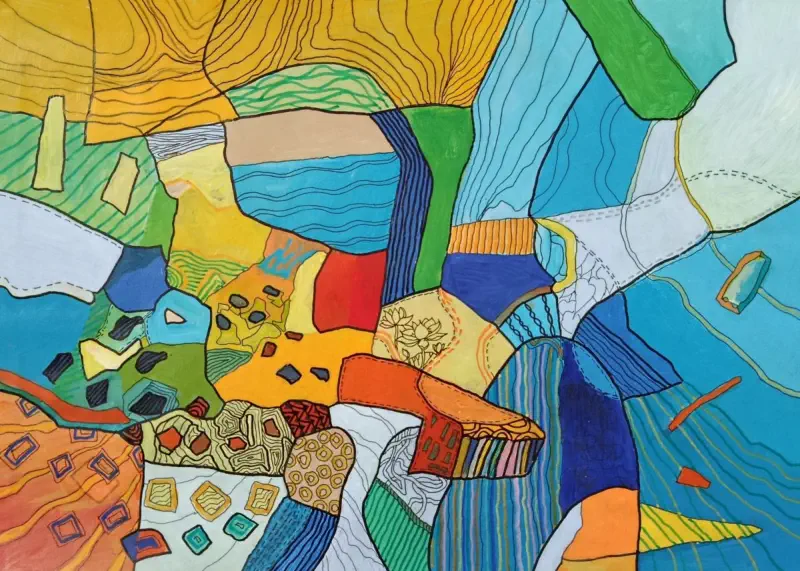 enclosed, yet open—shapes outlined with bold lines, filled with textures