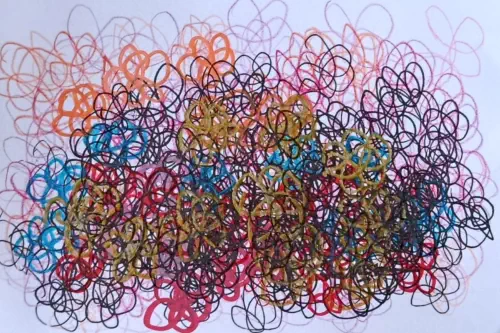 colours—orange, gold, black, red, blue, and violet—build into a thicket