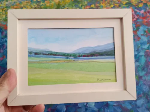 The above painting is a small-scale, framed watercolour landscape. It is