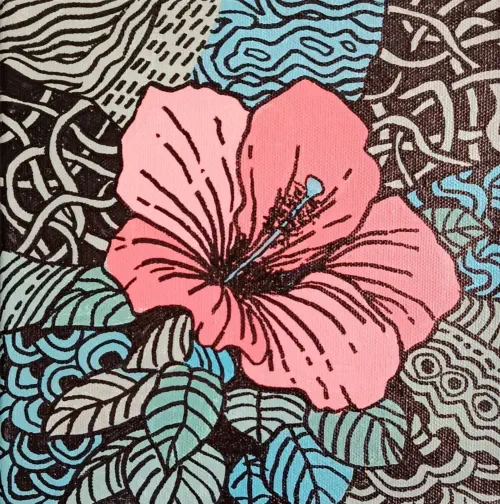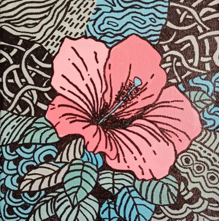the maze of textures but always returns to the vibrant pink flower at