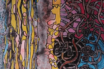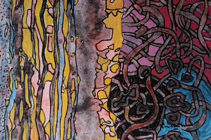 On the right side, the swirling, tangled black lines weave across a