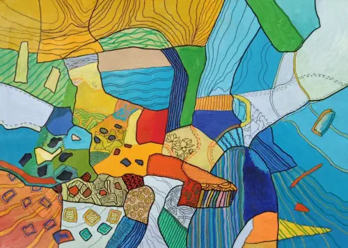 colour, line, and pattern in a patchwork that suggests both a landscape