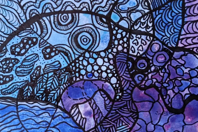 The style is a fusion of abstract doodle art and intuitive ink drawing
