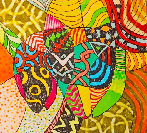 while the coloured inks and markers—reds, oranges, yellows, greens,