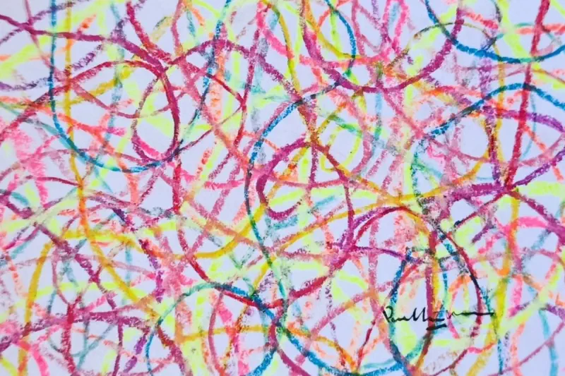 This piece bursts with luminous, interweaving loops of colour — pinks,